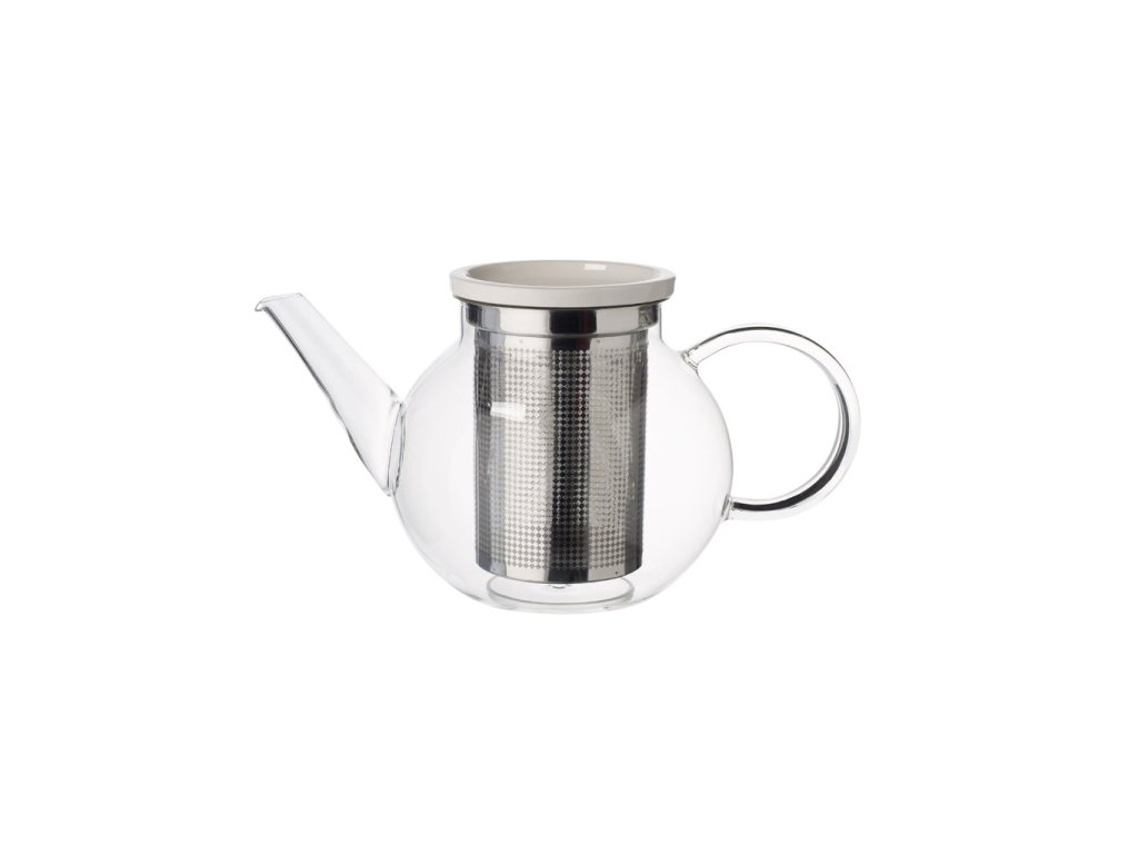 Sklenený džbán s rukoväťou na štýlové podávanie horúcich nápojov, praktické sitko z nehrdzavejúcej ocele vhodné na prípravu aromatických čajov.