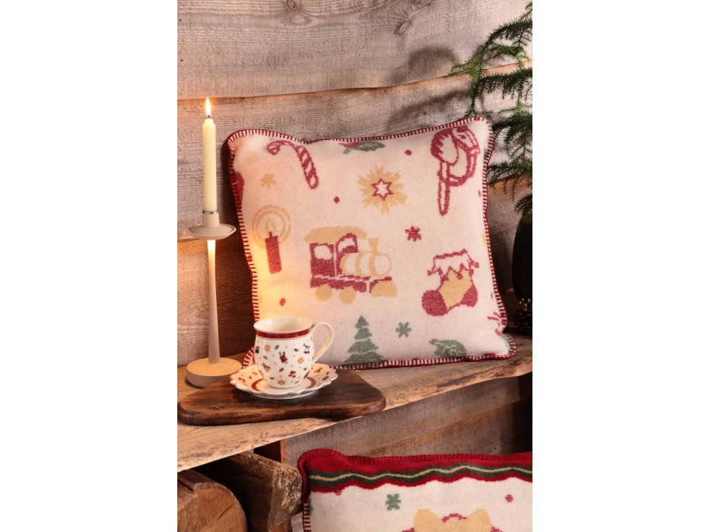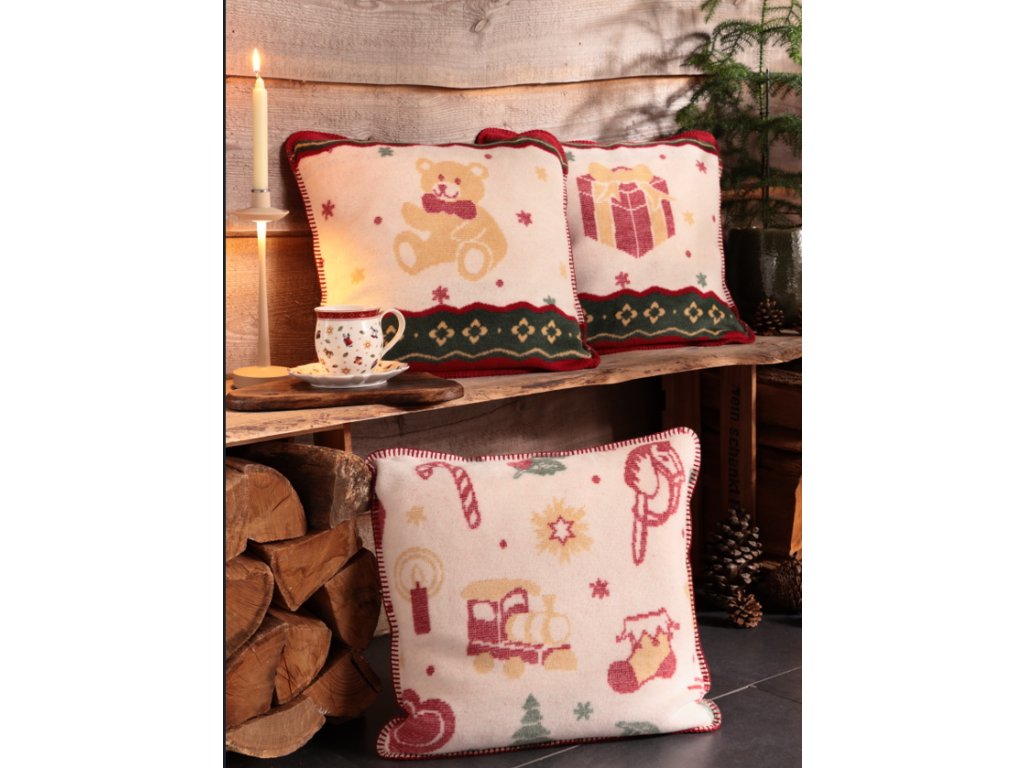 Vankúš s motívom hračiek s výplňou 50 x 50 cm. Druhá strana je červená.