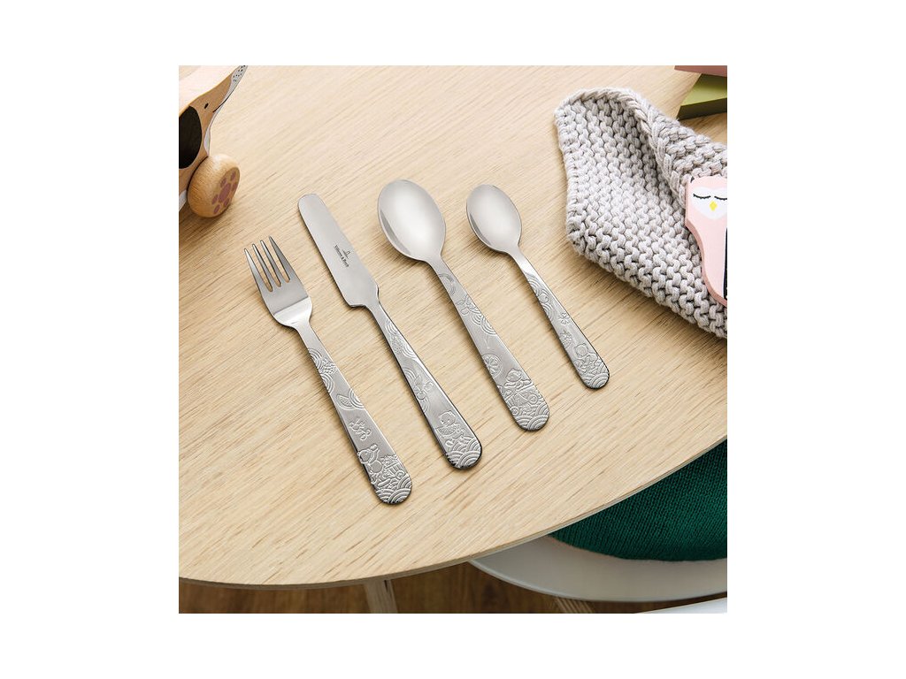 Dokonale vyvážený a robustný detský príbor pozostávajúci z 1x lyžice, 1x vidličky, 1x noža a 1x čajovej lyžičky, ideálna veľkosť pre detské ruky.