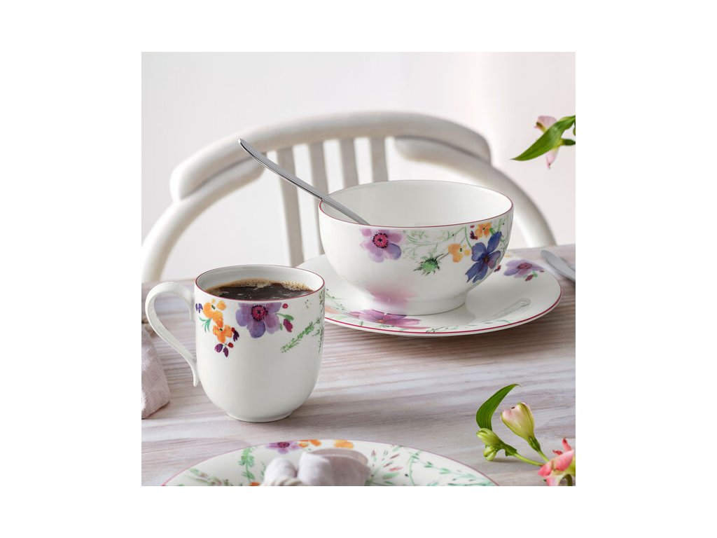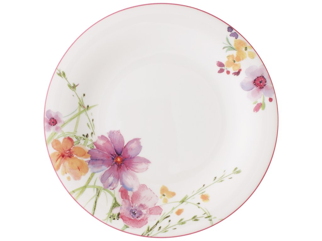 Šarm Mariefleur: Atraktívny tanier na jedlo z bieleho prvotriedneho porcelánu je zdobený príjemnými pastelovými motívmi kvetov.