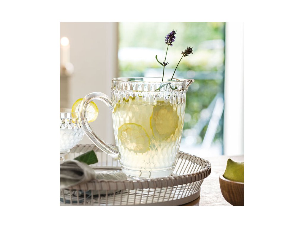 Výrazný vzor brúseného skla a robustné vysokokvalitné spracovanie tohto džbánu upútajú pozornosť na každom stole.