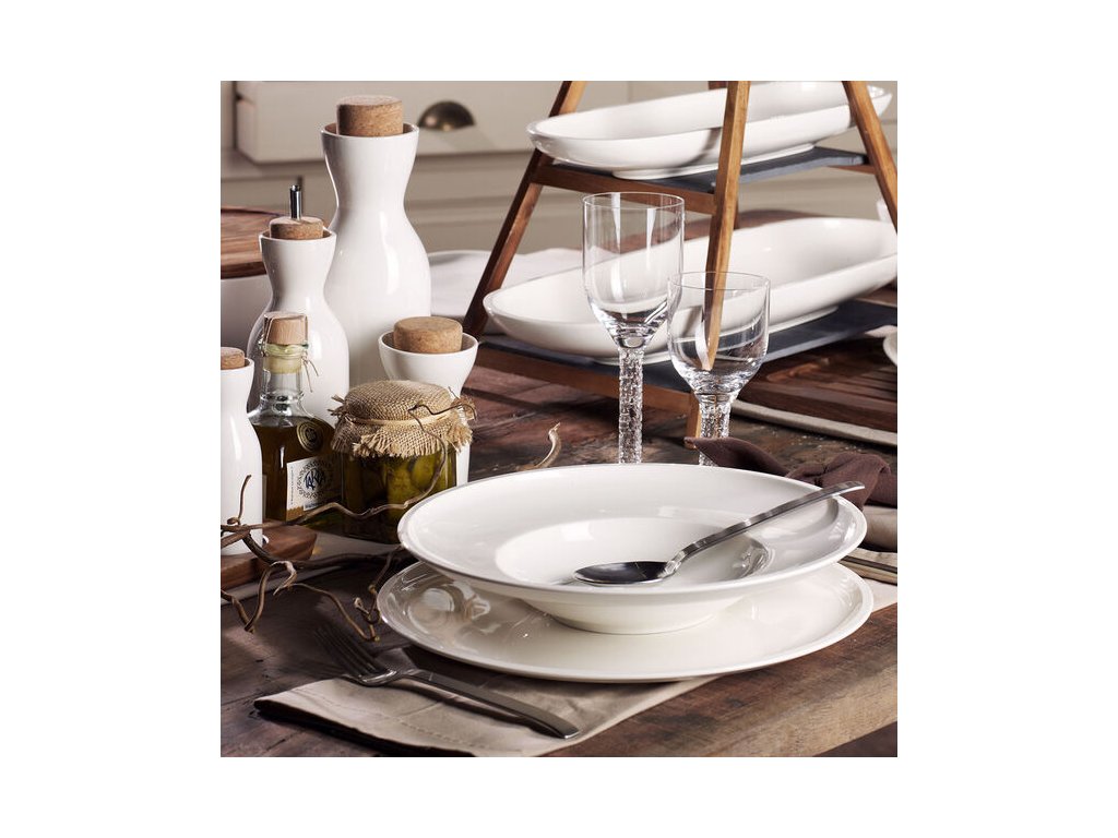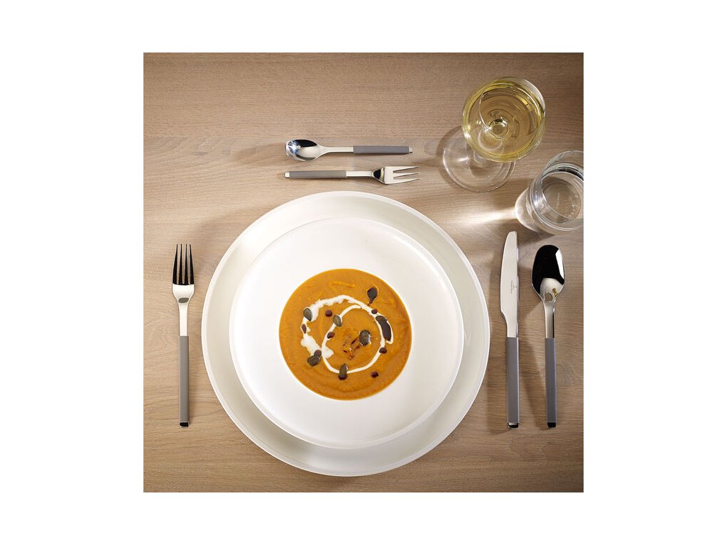 Optimálna hĺbka pre husté polievky, široký okraj umožňuje čisté servírovanie a možno ho použiť ako podnos na príbory.