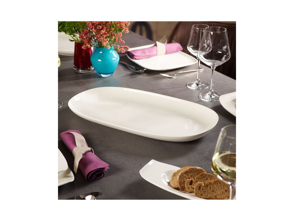 Štýlový pútač pohľadov: Oválna servírovacia miska s vyvýšeným okrajom je ideálna na čisté a elegantné servírovanie všetkých druhov príloh.