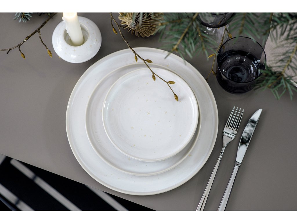 Štýlová porcelánová plytká miska v minimalistickom dizajne pripomínajúcom nočnú oblohu. Každý kúsok je zdobený malými zlatými hviezdičkami. Vyčarí tú správnu vianočnú atmosféru.