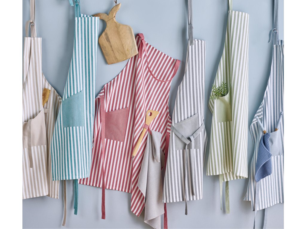 Bavlnená zástera s pruhmi v rôznych farbách.