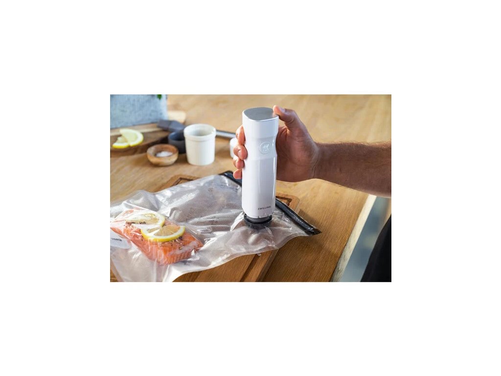 Takto to funguje: Jednoducho naplňte vrecko a zatvorte ho praktickým zipsom odolným voči presakovaniu. Pripojte vákuovú pumpu na ventil vrecka a stlačením tlačidla odsajete vzduch v priebehu niekoľkých sekúnd. Po dosiahnutí dostatočného podtlaku sa automaticky zastaví. Potom jednoducho stlačte tlačidlo v strede červeného silikónového ventilu na vrecku, aby ste ho bezpečne uzavreli. Aromatické látky a vitamíny sú uzavreté a potraviny zostanú čerstvé až päťkrát dlhšie!