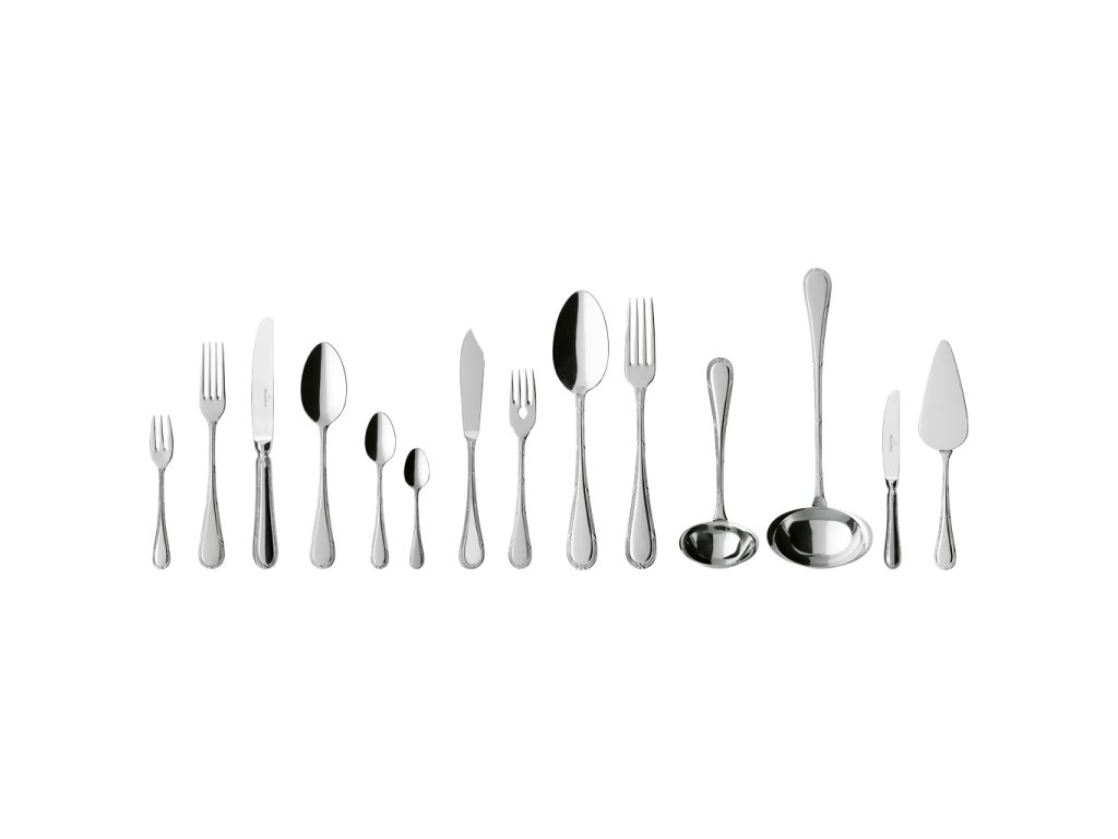 12 lyžíc, 12 vidličiek, 12 nožov, 12 vidličiek na ryby, 12 nožov na ryby, 12 kávových lyžičiek, 12 lyžičiek na espresso, 12 vidličiek na torty, 12 nožov na torty, 1 vidlička na zeleninu, 1 zeleninová lyžica, 1 lyžica na omáčku, 1 naberačka na polievku, 1 lopatka na torty