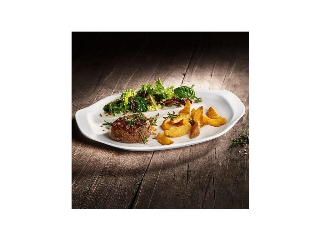 Oddelené servírovanie mäsa, rýb, zeleniny a dipov na tanieri. Praktické priehradky. Chytré úchyty na jednoduché servírovanie.