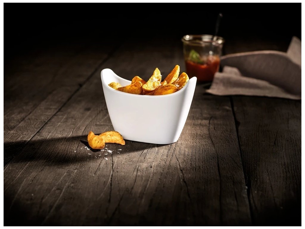 Štýlové podávanie domácich zemiakových placiek a hranolčekov, Sofistikovaný dizajn okrajov, vďaka ktorému vyzerá ako klasická miska na hranolčeky.