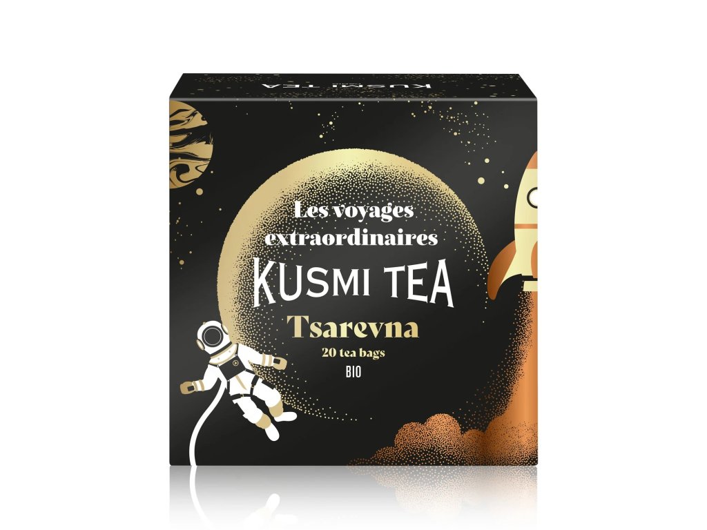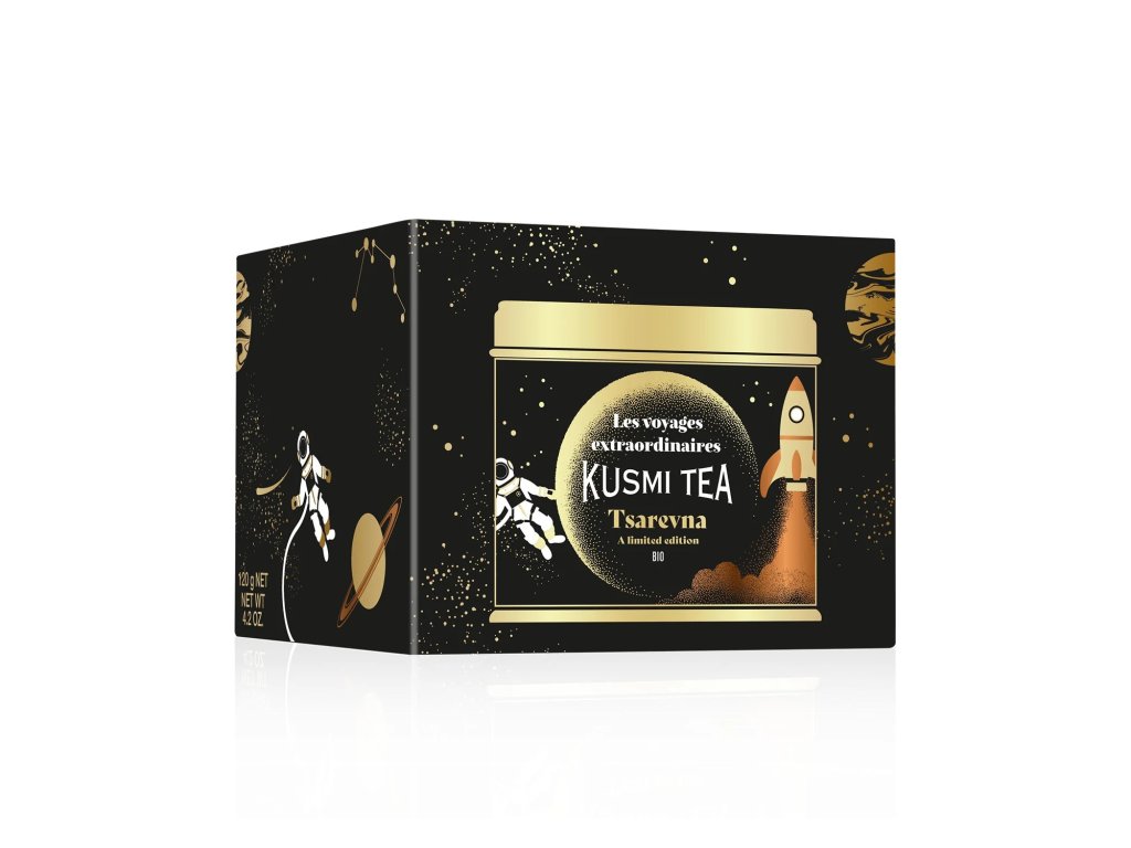 Limitovaný vianočný čaj Kusmi Tea Tsarevna. Organický čierny čaj s podmanivou vôňou pomarančov, korenia, vanilky a mandlí v originálnej tmavej kovovej dóze dekorované motívy z fascinujúceho sveta podľa Julese Verna.