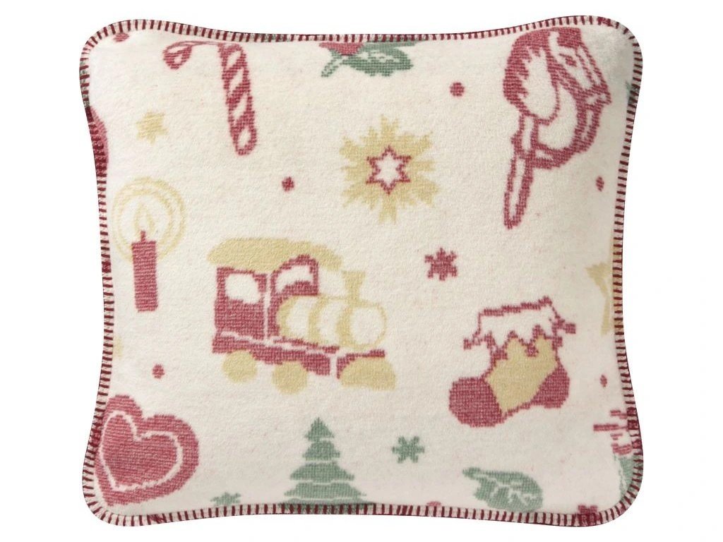 Vankúš s motívom hračiek s výplňou 50 x 50 cm. Druhá strana je červená.
