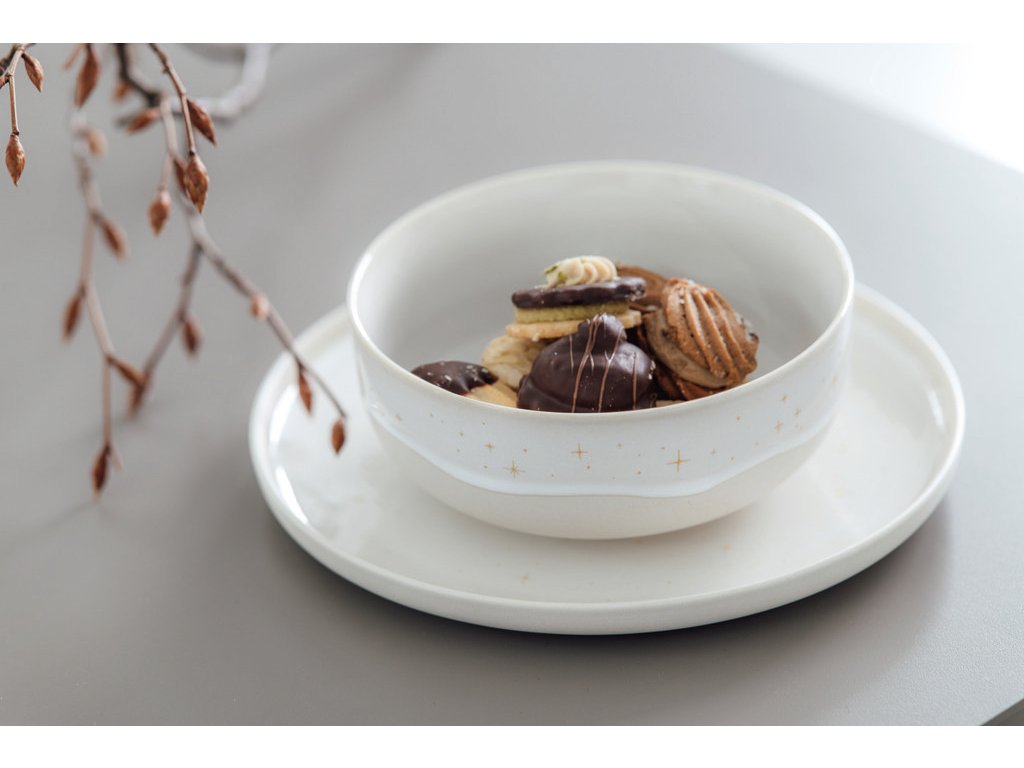 Štýlová porcelánová miska v minimalistickom dizajne pripomínajúcom nočnú oblohu. Každý kúsok je zdobený malými zlatými hviezdičkami. Vyčarí tú správnu vianočnú atmosféru.