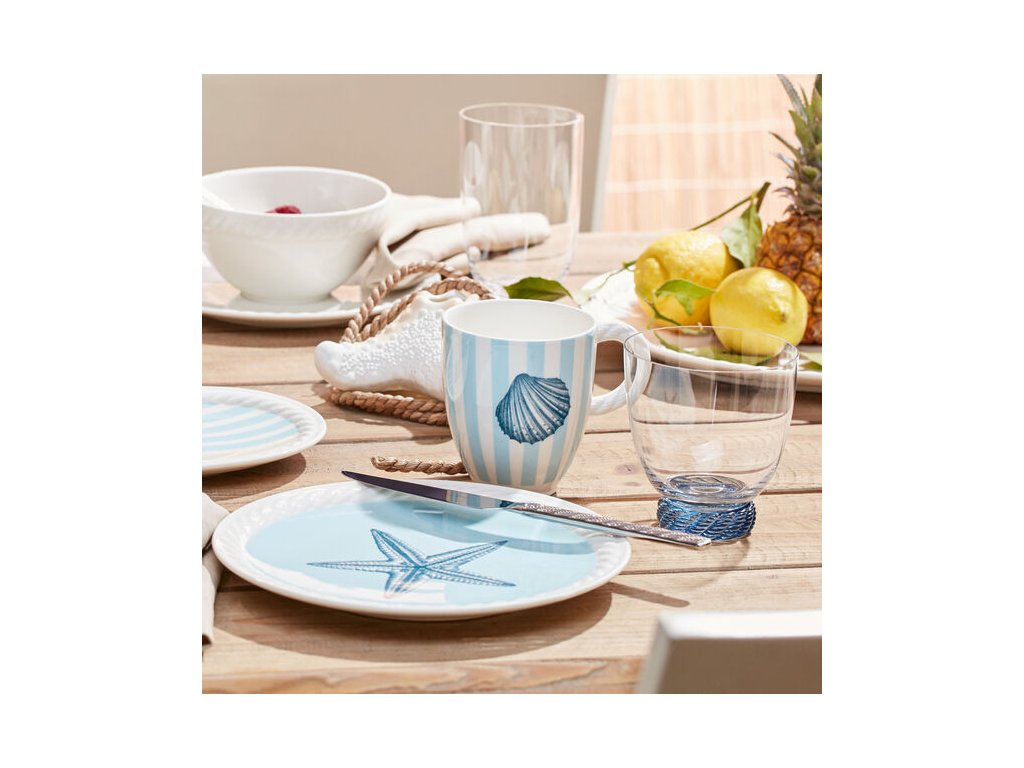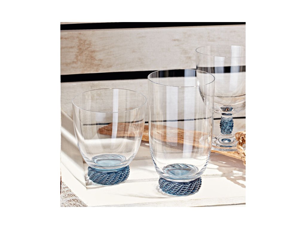 Ideálne na servírovanie vody, limonád alebo dezertov, Diskrétna modrá farba a reliéf v podobe lana na sklenenom dne upúta pozornosť.