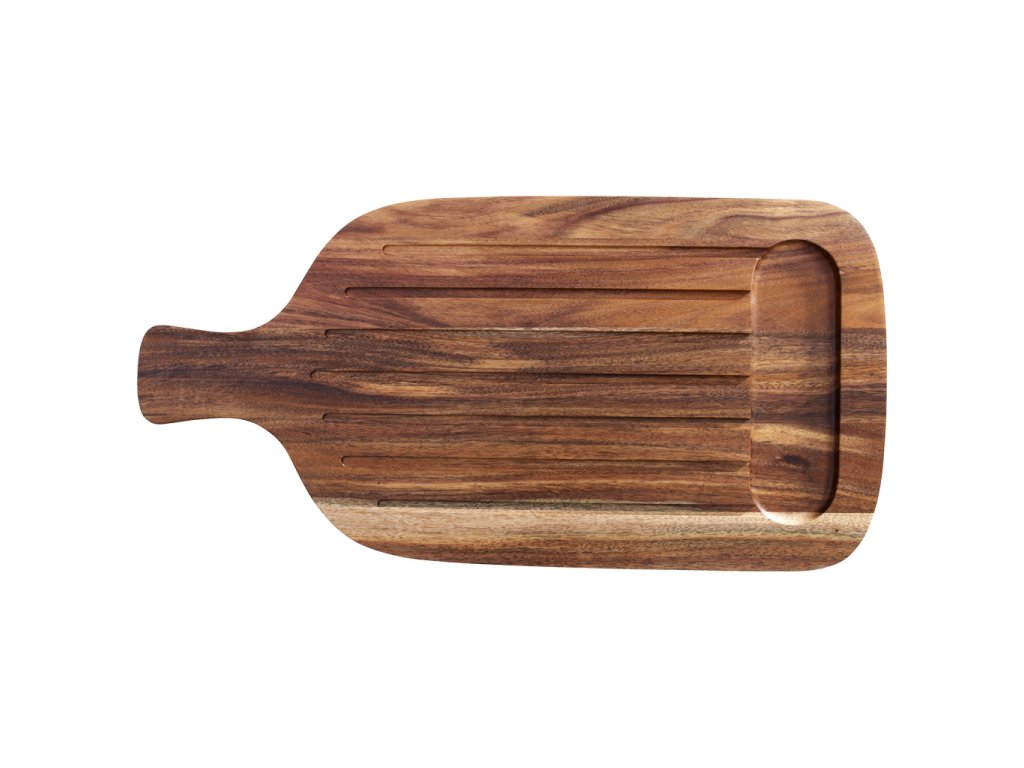 Drážky na krájanie a malá priehradka na zachytávanie tekutín, rukoväť na jednoduché servírovanie, optimálne na aranžovanie a krájanie rôznych potravín.