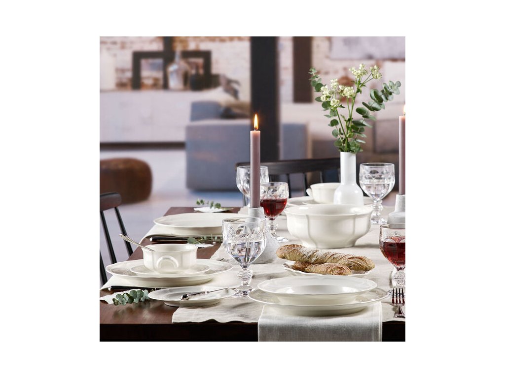 Široký, mierne vyvýšený okraj slúži na odkladanie polievkovej lyžice alebo chleba, elegantný pútač pozornosti na stole.