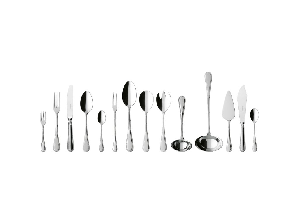 12 lyžíc, 12 vidličiek, 12 nožov, 12 kávových lyžičiek, 12 vidličiek na koláče, 1 vidlička na mäso, 1 servírovacia vidlička, 1 lyžica na zeleninu, 1 lyžica na šalát, 1 vidlička na šalát, 1 lyžica na omáčku, 1 naberačka na polievku, 1 zdvihák na koláče, 1 lyžička na cukor, 1 podnos na príbor
