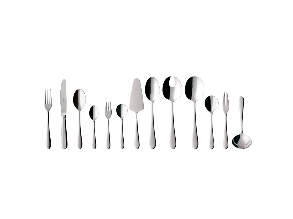 12 lyžíc, 12 vidličiek, 12 nožov, 12 kávových lyžičiek, 12 vidličiek na koláče, 1 polievková lyžica, 1 vidlička na mäso, 1 zeleninová lyžica, 1 šalátová lyžica, 1 šalátová vidlička, 1 naberačka na omáčku, 1 lopatka na koláče, 1 cukrová lyžička.