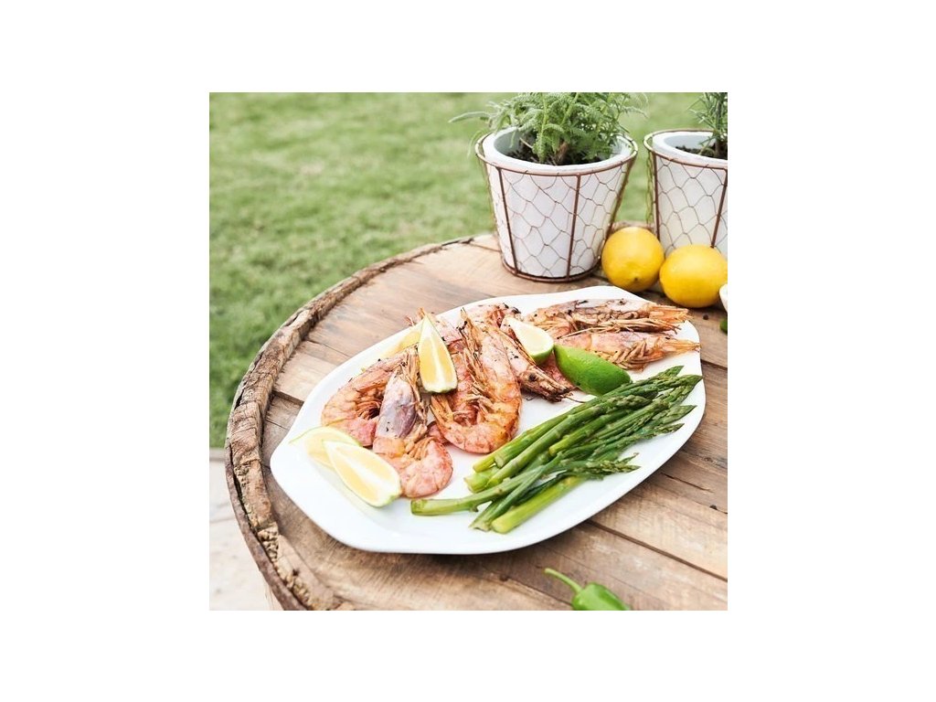 Oddelené servírovanie mäsa, rýb, zeleniny a dipov na tanieri. Praktické priehradky. Chytré úchyty na jednoduché servírovanie.