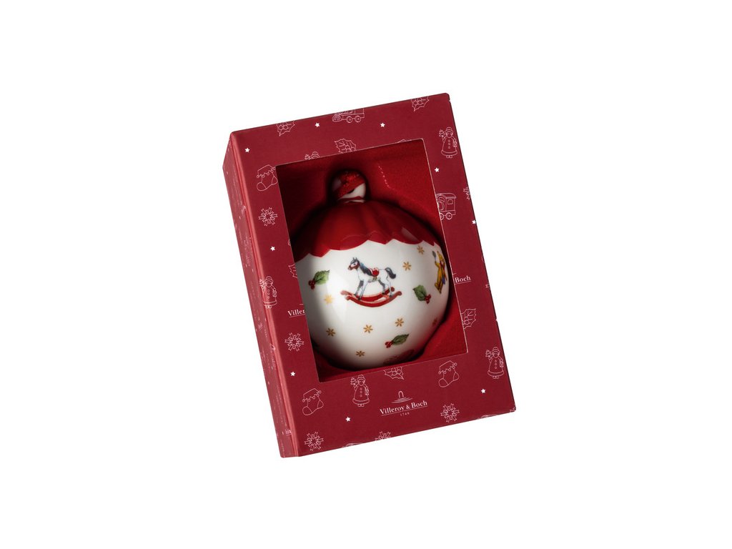 Červená stuha pre elegantný vzhľad, dekorácia porcelánovej gule so vzorom typických hračiek zo severného pólu.
